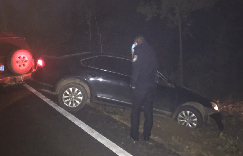 2022年12月16日晚,桐柏县公安局大河派出所民警在辖区开展夜间巡逻防控。22时许,当民警巡逻至大河镇土门村至上河村的某道路附近时,发现一黑色轿车停在道路旁的土坡中,车头被路牙撞损,情况异常。民警立即下车查看,经了解得知,该车驾驶员张某,男,20岁,刚刚考取驾照,该黑色轿车系其叔叔的车辆,因其叔叔醉酒,张某就当起了“代驾”,驾驶车辆送其叔叔和其他两人回家。当车辆行驶至土门村某组道路附近时,停车接打电话,由于驾驶技能不熟练,再次起步时,因踩油门力度过大,车辆失控,导致冲出公路旁的土坡之中,幸好没有人员受伤,车辆也只是前保险杠剐蹭,不影响正常驾驶。但由于该车为手动挡,张某坡道起步技术不行,怎么也无法挪移出来。
