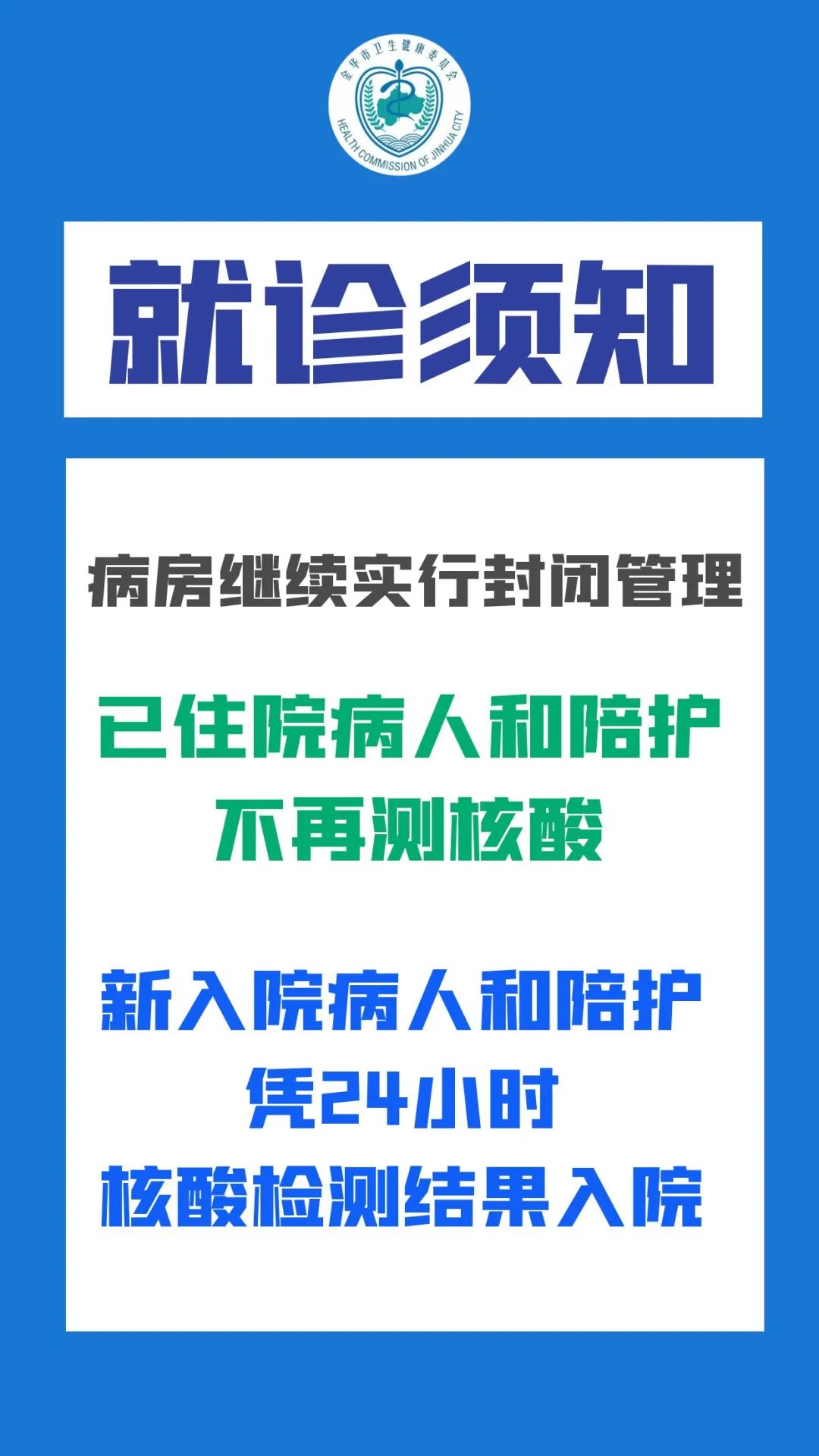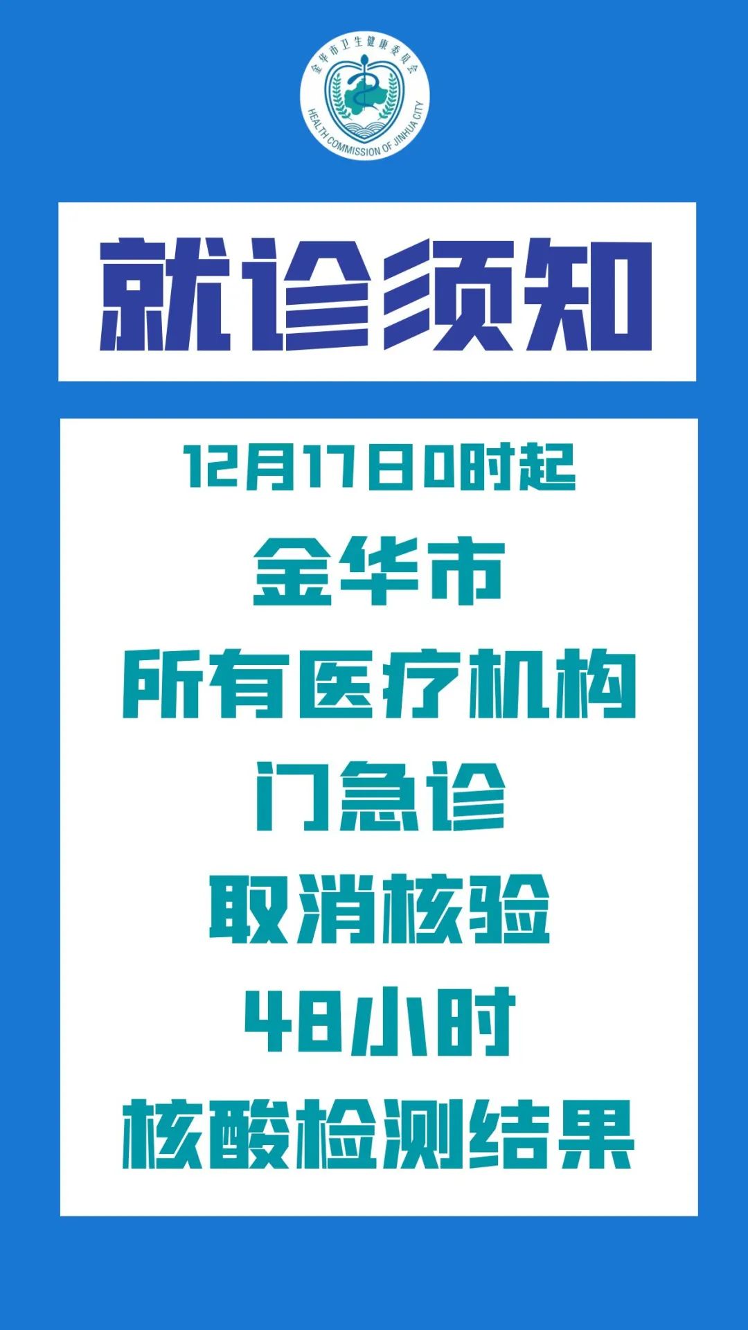 为进一步优化门急诊就医流程,方便群众看病就医,从12月17日零时起,丽水全市所有医疗机构门急诊取消核验48小时核酸检测阴性证明。住院患者在入院时进行1次核酸检测,病区继续实行封闭管理。详情》