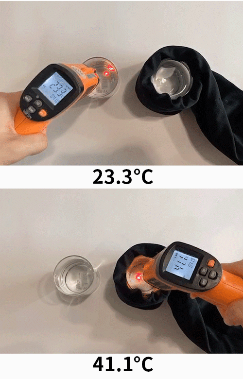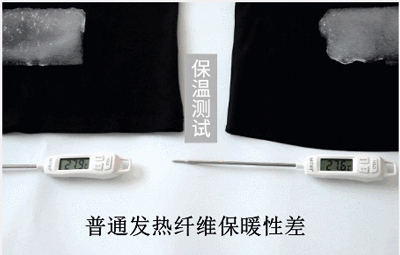 待 10 分钟后抽出温度计,光暖面料明显比普通面料的温度高出 9℃ ,可见它良好的保暖性能。