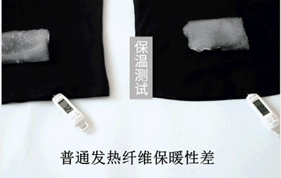 在同等室温 27.6℃ 情况下,将温度计分别插入放有冰块的普通面料和光暖面料中;