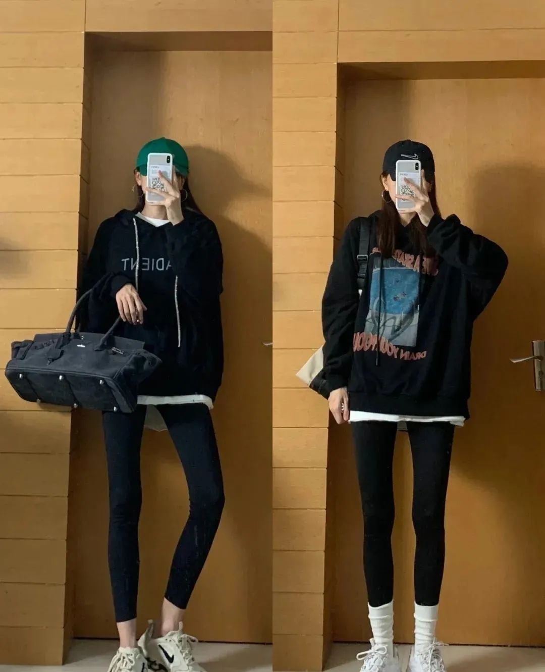 不管是卫衣还是长 T,不管上身是紧身还是宽松衣服,都能搭配出不同的感觉。