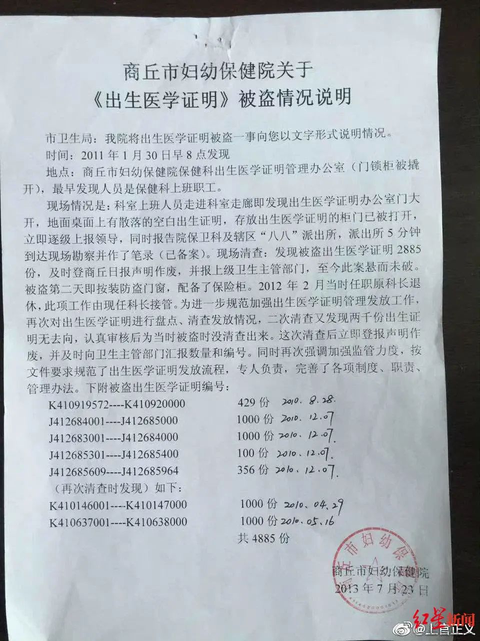 商丘市妇幼保健院方面2013年发布的一份情况说明显示,2011年1月30日,该院保健科室职员早上上班时发现,存放出生医学证明的办公室门大开着,地面和桌面上散落着空白的出生证明。警方和院方清点发现,有2885份出生证明被盗。