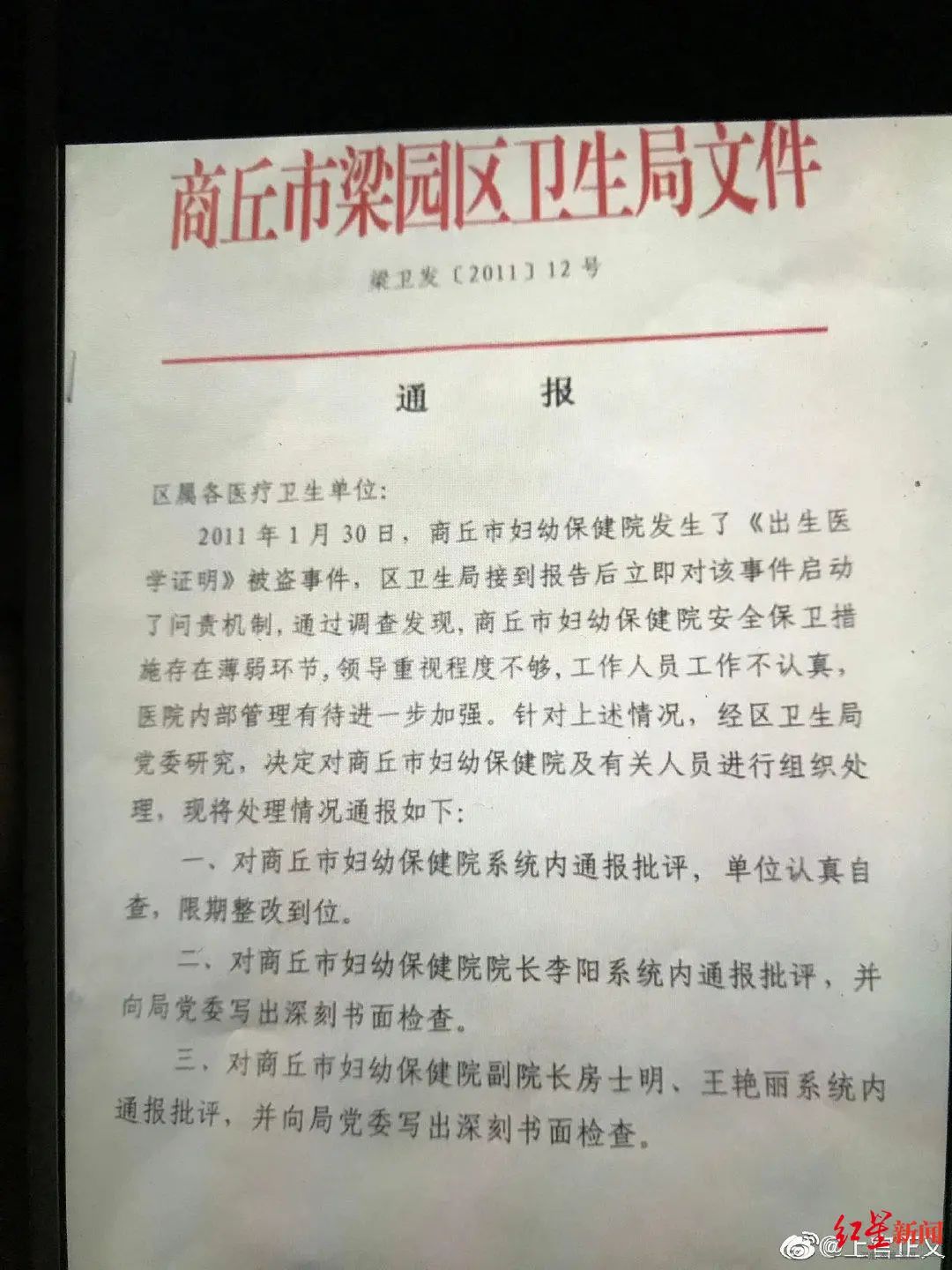 当年,商丘市梁园区卫生局对此发布了通报,对商丘妇幼保健院系统内通报批评,对时任商丘妇幼保健院的院长和两名副院长进行通报批评,并对相关科室负责人予以免职。