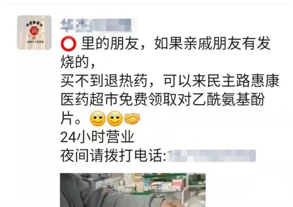 商丘宝妈刘女士就免费领了药,15日深夜,因为家人发烧,而她四处找不到退烧药,心中焦急。就在此时,她看到朋友圈有人转发了惠康医药超市免费发药的信息。刘女士介绍,药确实是免费的,当天夜里,她骑车五公里,最终赶到药店领了药。