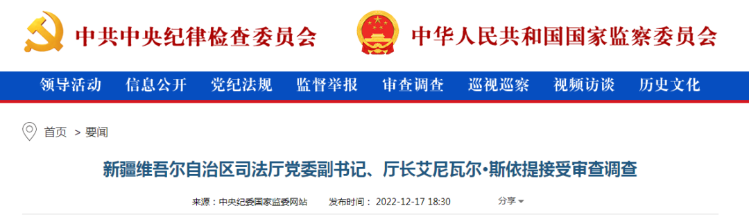 12月17日,新疆维吾尔自治区纪委监委发布消息,新疆维吾尔自治区司法厅党委副书记、厅长艾尼瓦尔·斯依提涉嫌严重违纪违法,主动投案,目前正接受新疆维吾尔自治区纪委监委纪律审查和监察调查。