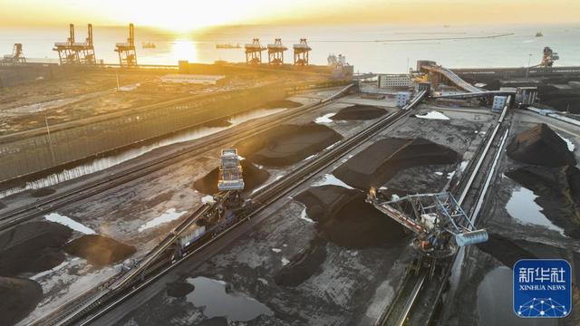 11月13日,唐山港京唐港区煤炭堆场的堆取料机在作业(无人机照片)。新华社发(刘满仓摄)