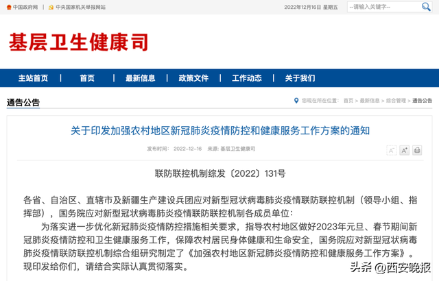 12月16日,国家卫健委网站发布消息,国务院应对新冠肺炎疫情联防联控机制综合组发布《加强农村地区新冠肺炎疫情防控和健康服务工作方案》,就元旦、春节期间农村地区疫情防控和健康服务等工作作最新部署。要点如下↓↓↓