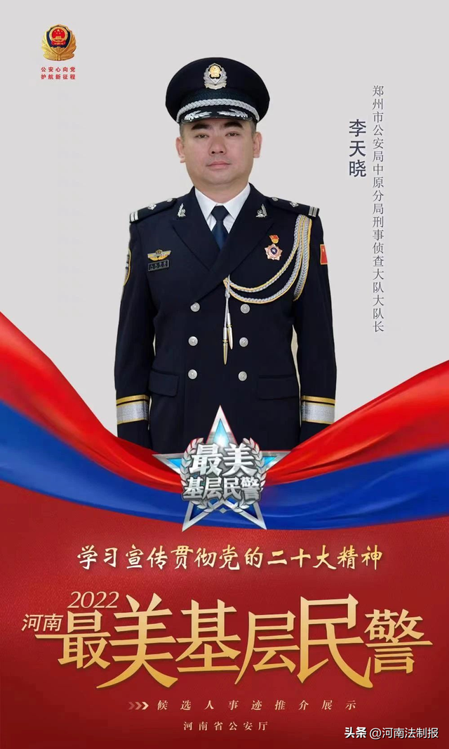 李天晓,男,中共党员,现任郑州市公安局中原分局刑事侦查大队大队长,从警期间,荣立个人二等功一次、个人三等功两次,先后被授予“全省人民满意政法干警”“优秀中原卫士”等荣誉称号,2022年5月荣获“全国优秀人民警察”荣誉称号。