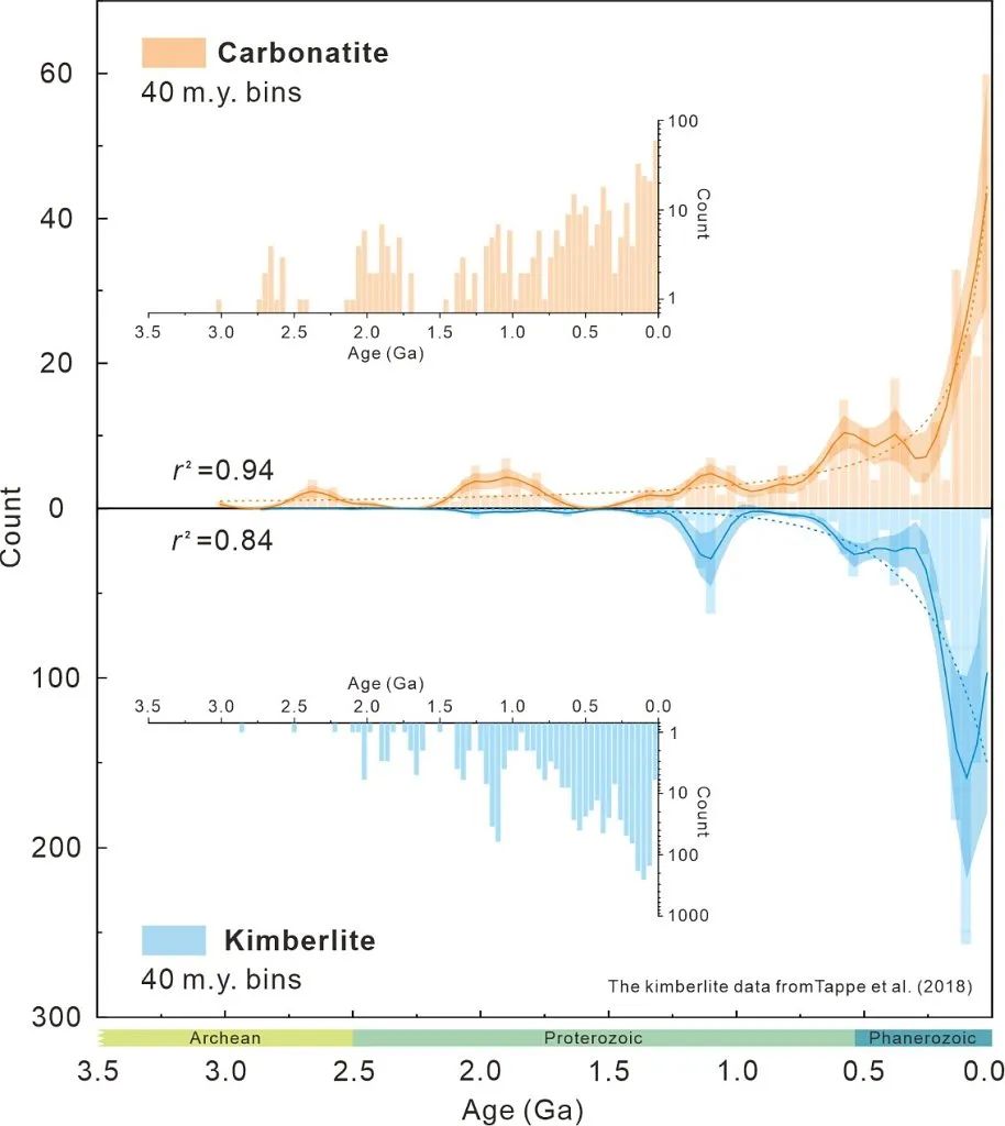 次大陆岩石圈地幔(SCLM)是地球内外相互作用的边界层,既对地球内部热敏感,也与外部圈层构造体制相关,它贡献的两种不同的富挥发分岩石(碳酸岩和金伯利岩)可以上升到地表并保留下来。这使得这两种成因上相似、与热和构造相关、均具有一阶长期趋势和二阶周期韵律的岩石记录可以互相支持,并可作为探究地球热-构造演化史的绝佳着手点。