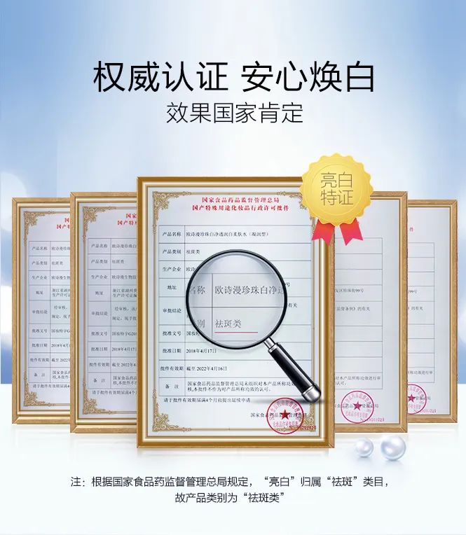 因为护肤品中的美白成分配比非常复杂,涉及到剂型、浓度等因素,这个证书相当于官方盖戳,有了这个资质,信任度就有超高加分。