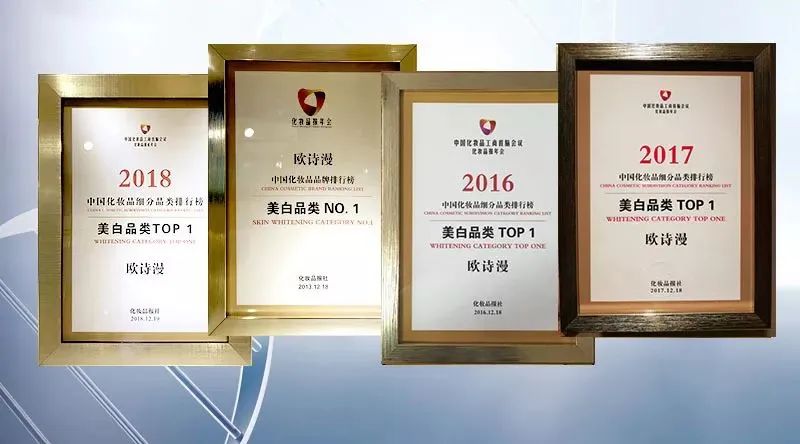 除了官方认证,欧诗漫旗下的美白产品在美容美妆领域获奖无数,甚至连续多年蝉联《化妆品报》颁发的美白品类大奖: