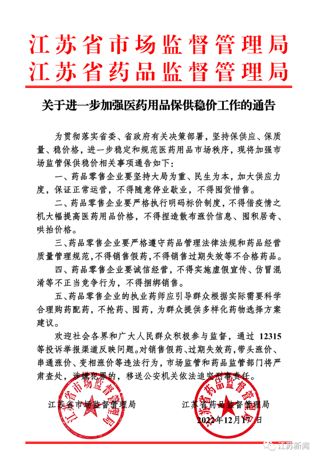 12月17日,江苏省市场监管局、省药监局联合发布《关于进一步加强医药用品保供稳价工作的通告》。