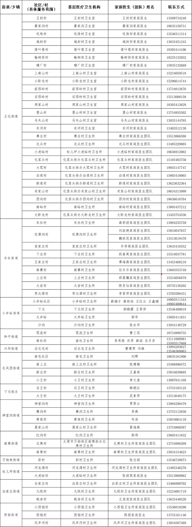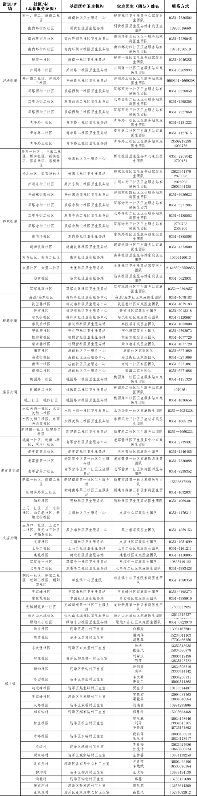 12月17日,太原市卫健委公布十县(市、区)家庭医生(团队)及其联系方式等信息,方便市民在疫情防控期间得到近距离服务。如果您尚未签约家庭医生服务,可通过社区网格化服务途径,及时联系查找本社区家庭医生(团队),医务人员将根据您的症状和相关情况给出具体指导意见。
