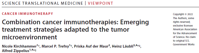 免疫检查点抑制剂(Immune checkpoint blockade, ICB)为癌症治疗带来了一场革命,然而肿瘤内部的改变和外部环境因素会导致ICB抗性的出现。为此,来自巴塞尔大学肿瘤医院的Heinz Läubli和Alfred Zippelius共同在Science Translational Medicine上发表了题为Combination cancer immunotherapies: Emerging treatment strategies adapted to the tumor microenvironment的观点性文章。总结了实体瘤近年来免疫疗法的发展进步,强调了在转化研究和临床试验上取得的进步。