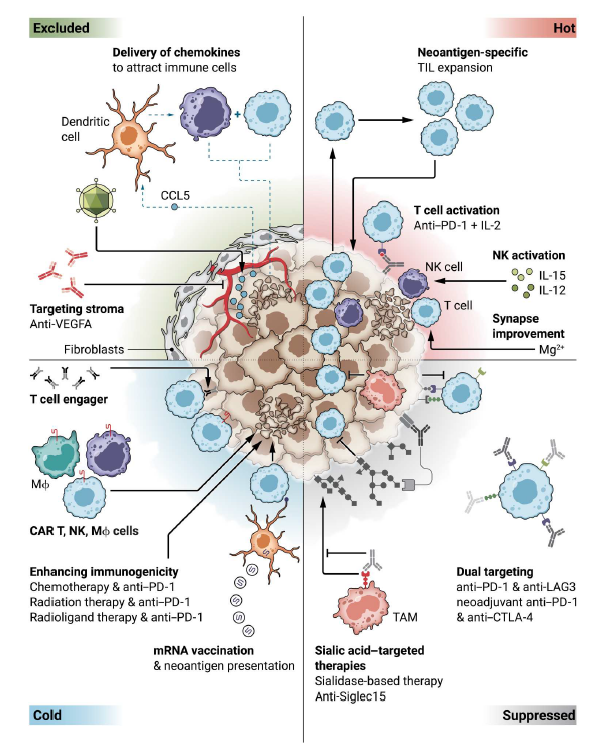 癌症免疫抗性主要是由于癌细胞或免疫细胞上的抑制性配体触发了免疫检查点,基于此,靶向CTLA4,PD-1,PD-L1的ICBs在多种癌症类型中展现出了可观的临床效应。然而,其具体的响应取决于肿瘤微环境(TME)的组成(肿瘤细胞免疫原性、免疫细胞浸润程度等),一方面,TME包含多种细胞类型和胞外基质,影响了肿瘤的发生发展和对治疗的响应,另一方面,其免疫抑制特征能帮助肿瘤逃过活化T细胞的杀伤。一直以来,TME被分为热肿瘤、冷肿瘤、免疫抑制性肿瘤和排除性(excluded)肿瘤,文章总结了过去3年的研究,更新了针对不同TME亚型抗性的治疗策略。