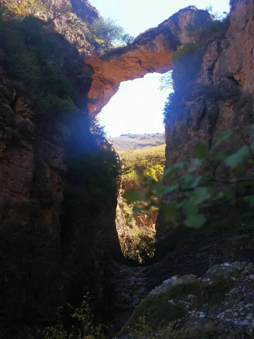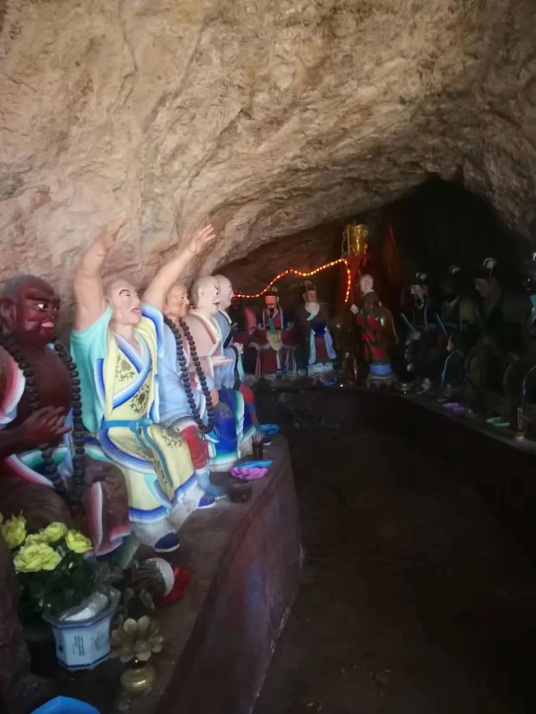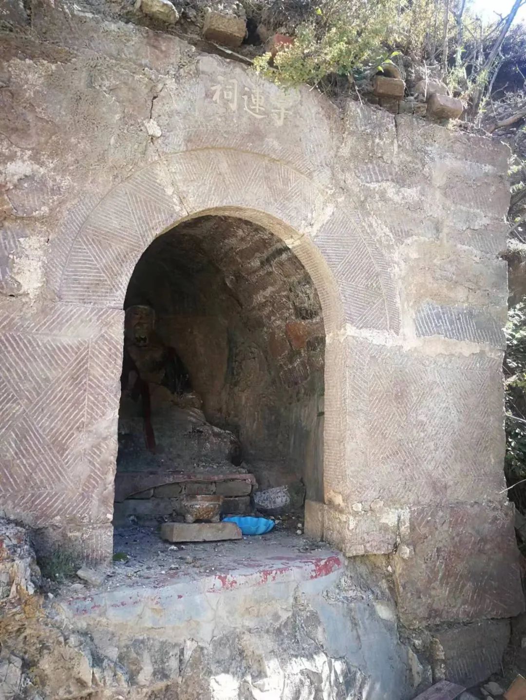 真不想离开这迷人的山和那鬼斧神工打造的洞,在留恋中不情愿地迈开了下山的脚步,在下山赶往停车处时偶遇一放牧者,他说拐弯处还有一座庙,你们没上去吧?于是又顺着放牧者指的方向,踏着河槽里的河卵石继续朝他指的方向走去,其实不远,山体相连,拐了个小弯也就二三十米的样子,就看见夹在山缝的半山腰处有一座寺庙型同罗汉洞,其规模稍小了点,远远望去在通往寺庙的正面有一木制栈道直通寺庙,由于十多年岁月风雨摧残不能胜任栈道的功能了,还是那句老话,要知山中事需问山中人,出发前已有原来看庙的老者提示过我们,说栈道不能攀登有危险,我们只好攀着岩石小心翼翼地向上爬,约摸二十分钟到达寺庙前,它的左侧是一道很大的天然豁口,其外形轮廓像极了一支脚印,内测山体光线暗淡背对阳光,显得阴森森的,豁口的外面在没有遮挡的光照下满目葱绿,山树相依、蓝天白云、草长莺飞,漂亮的景致、明暗强烈的反差像穿越走进了一个童话世界,豁口的上方是一个巨石天桥,横搭在两山头之间,鬼斧神工、自然造化,像是人工有意为之,很是壮观。庙很宽敞,里边没有石砌券门,也有一个洞,位置稍高些,洞口放着一个棺材,棺材没有封口半开着,庙内有彩绘泥塑像,像前有一修复后立的小黑石碑,上书“玉莲洞”三个大字,我很疑惑罗汉洞那儿是“宇连祠”,这里又有“玉莲像”,不知是几个意思,是同一个人吗?