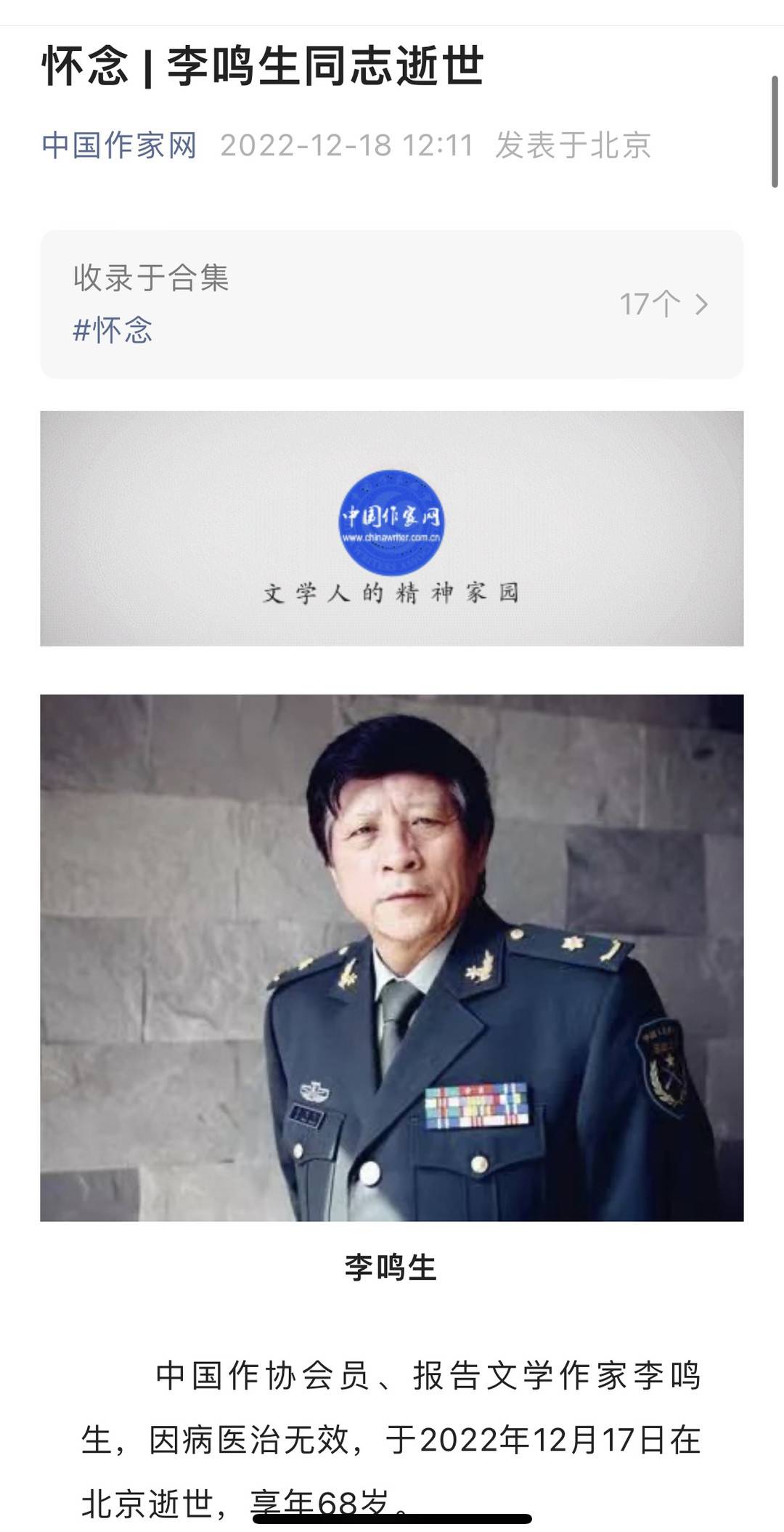 据中国作家网报道,中国作协会员、报告文学作家李鸣生,因病医治无效,于2022年12月17日在北京逝世,得年68岁。
