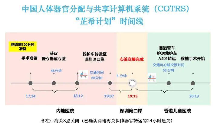 “在COTRS的协调下,内地与香港近24个部门和65位医疗与管理专家在24小时内紧急通力合作,两地医疗团队以及深圳与香港海关均进行紧急模拟演练,将通关时间压缩至8分钟,与4个小时的心脏保存极限时间赛跑。”王海波介绍,12月16日17时24分开始捐献心脏获取,当日20时13分救护车在香港警车护送下将内地爱心捐献心脏送达香港儿童医院。12月17日凌晨1时,芷希小朋友的心脏移植手术顺利完成,从手术室转入儿科ICU。截至目前,芷希已不需要体外循环支持。