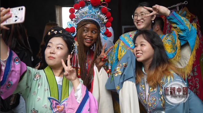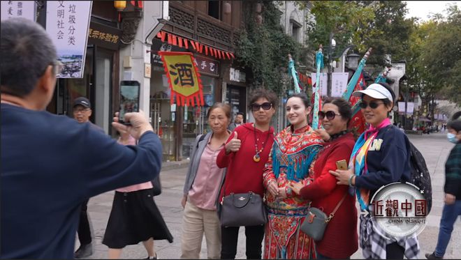 外国留学生们在这儿领略到了西安高腔传习所表演的《扈家庄》桥段。他们还穿着戏服,在古街上游览拍照,过了一把瘾。路人纷纷要求合影,竖起大拇指:太漂亮了!