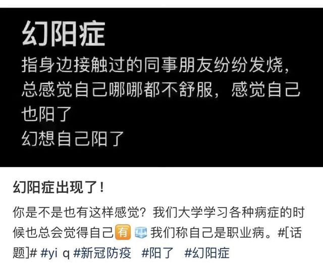 上述专家表示,从心理学专业来说当然不存在“幻阳症”,“幻阳”的出现,反映的其实是大家在面对短期内疫情发展迅速变化,心理上出现的不适应状态。调侃“幻阳”的背后,是大家对阳了之后未知情况的焦虑:青少年担心影响学业、中年人担心工作进度受影响的同时还十分担心家中老人孩子感染了怎么办、老年人担忧对身体状况的危害等等。