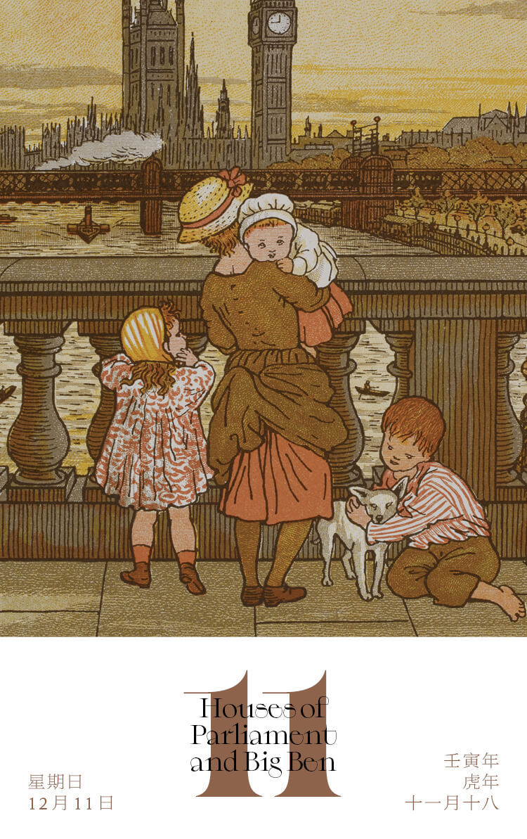 这幅插图出自1883年出版的儿童绘本《伦敦城》,创作者是著名圣诞贺卡设计师托马斯·克莱恩,画面描绘了小女孩普鲁第一次和家人到伦敦游玩的场面,一家人站在泰晤士河畔的亨格福德桥上,眺望着远方的国会大厦和大本钟。