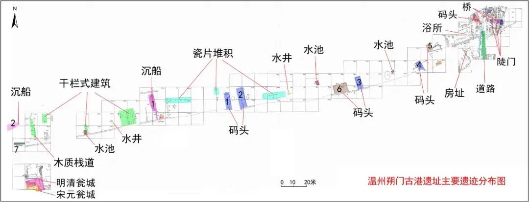 朔门古港遗址主要遗迹有古城水、陆城门相关建筑遗存、成组码头、浴所、木构栈道、干栏式建筑、水井等,并出土了沉船2艘,以及数以吨计的宋元瓷片和形式各样的漆木器等重要遗物,各类遗存年代跨度从北宋延续至民国,尤以宋元为主。该遗址是近年来我国港口考古、城市考古的重大收获,它填补了国内外海丝港口类遗产的空白,堪称海丝申遗的经典样本和支撑性遗产点。
