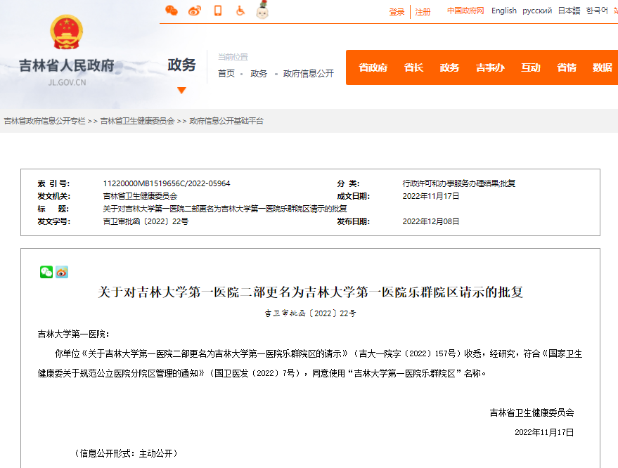 你单位《关于吉林大学第一医院二部更名为吉林大学第一医院乐群院区的请示》(吉大一院字〔2022〕157号)收悉,经研究,符合《国家卫生健康委关于规范公立医院分院区管理的通知》(国卫医发〔2022〕7号),同意使用“吉林大学第一医院乐群院区”名称。