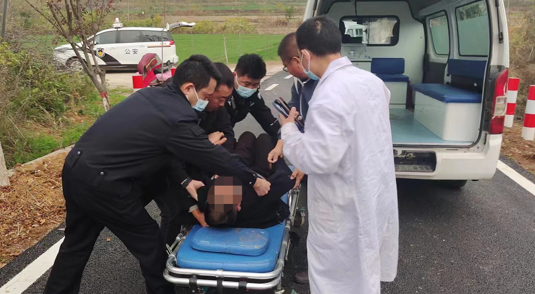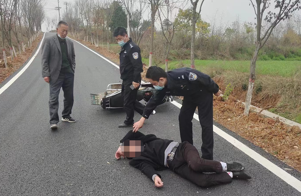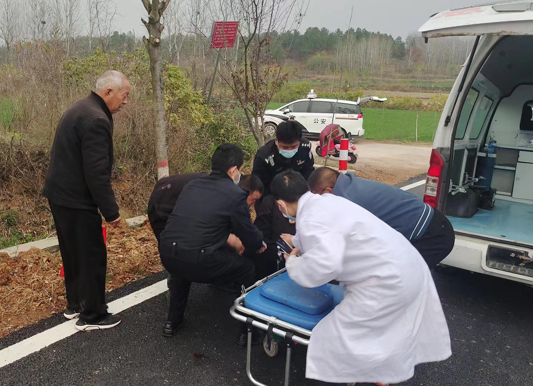 2022年12月18日下午16时许,桐柏县公安局程湾派出所民警巡逻至辖区程湾村某组路段,发现路边歪倒着一辆黑色两轮摩托车,旁边躺着一名男子。民警立即停车上前查看,同时在道路来车方向放置警示标志,防止造成次生事故。只见该男子面部朝地,民警将其身体翻转过来检查伤势,看到该男子头部及嘴角流血,处于昏迷不醒状态。民警当即拨打120急救电话,请求医护人员到场急救。民警对该男子身份进行核查,没有发现手机和相关证件。随后,120救护车赶到,民警和过路村民一起协助医护人员将该男子抬上救护车,紧急送往医院进行救治。