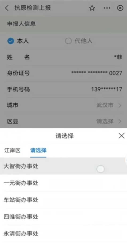2.自动生成申报人信息,选择所在城市、区县、街道、社区,填写详细地址。