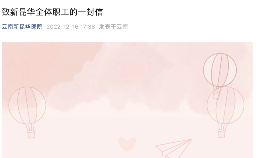 12月16日,云南新昆华医院发布《致新昆华全体职工的一封信》。