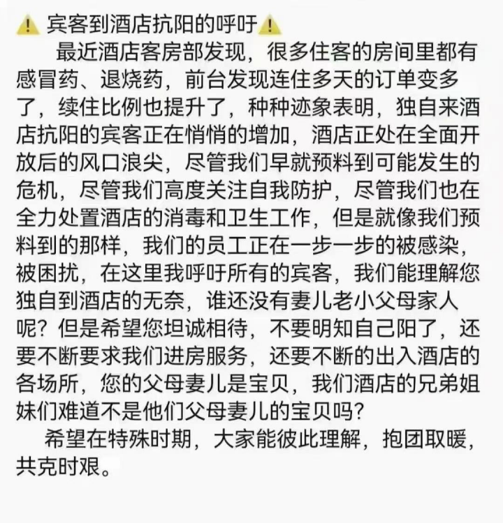 针对很多入住后才出现发烧等症状的客人,酒店也建议,不要隐瞒病情——这也是酒店方面最担心的。