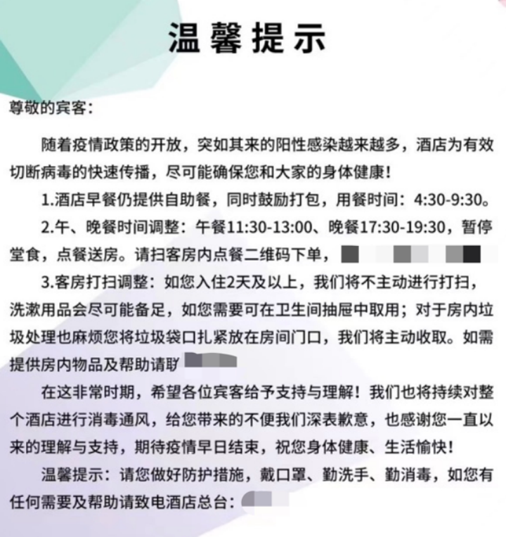 该负责人表示,客人感染之后,如果只是自我隔离在房间里,还比较安全。但因为不少酒店的早餐是自助式的,可以堂食,所以还有些感染后的客人会下楼吃早餐,并且让服务员进入房间打扫卫生。