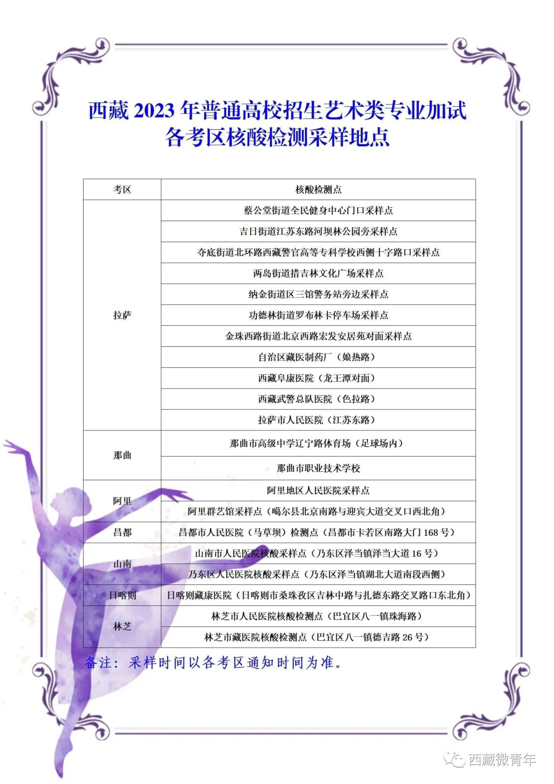 为确保广大考生和涉考人员身体健康,按照自治区核酸检测“应检尽检”要求,考生须在参加首场考试前(西藏民族大学考区考生执行属地组考防疫要求,另行通知)提供48小时核酸检测(以采样时间为准)。请考生按科目分类考试时间,及时主动,合理安排核酸检测,因未核酸检测采样造成的后果由考生承担。核酸检测点位详见附表。