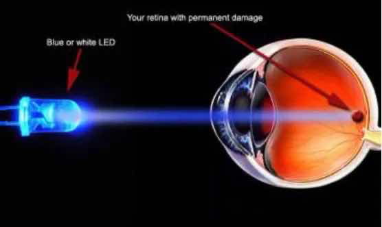 实验发现,蓝光强度超过1500lx(勒克斯,照度单位),直接照射视网膜3个小时以上,会导致视网膜细胞的凋亡和数量下降。