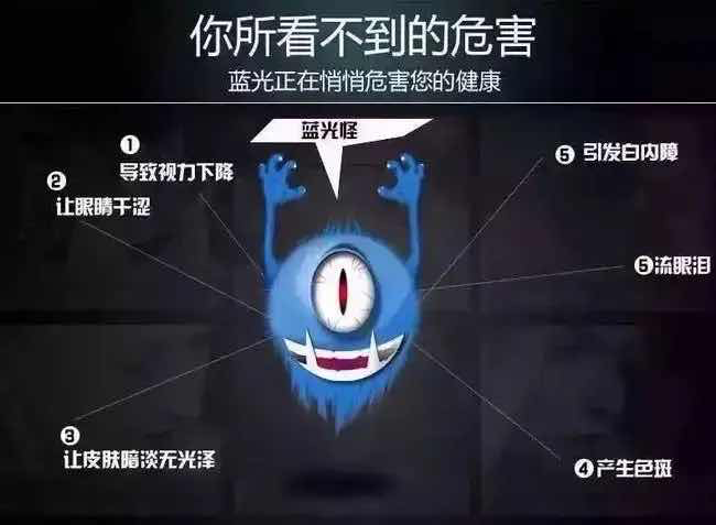 除了抑郁,失眠,眼睛疲劳,视力下降,蓝光还会让人产生色斑,白内障等危害。