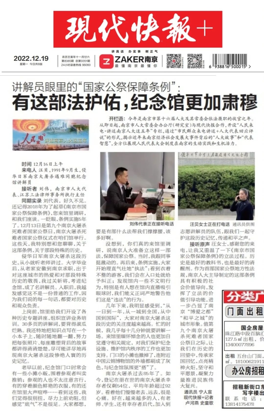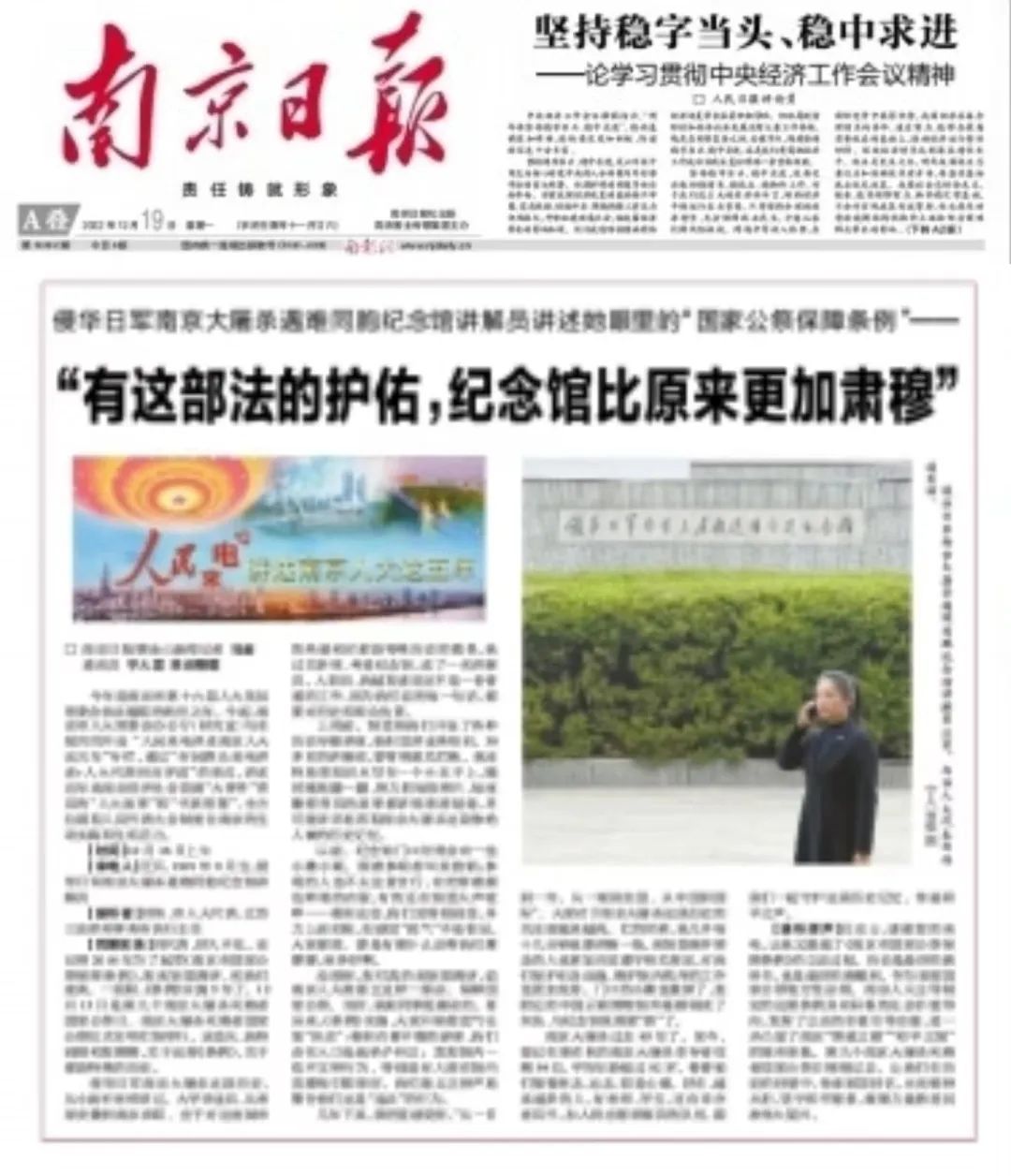 没想到,您们真的来馆里调研,说南京人大准备立这样一部法,保障国家公祭。当时,我跟同事挺激动的。再后来,条例实施,大家开始理直气壮地“执法”:看到衣着不整的游客,我们会在入口处就给予纠正;发现馆内一些不文明行为,特别是有人想在馆内直播吸引眼球时,我们能义正词严地警告他们这是“违法”的行为。