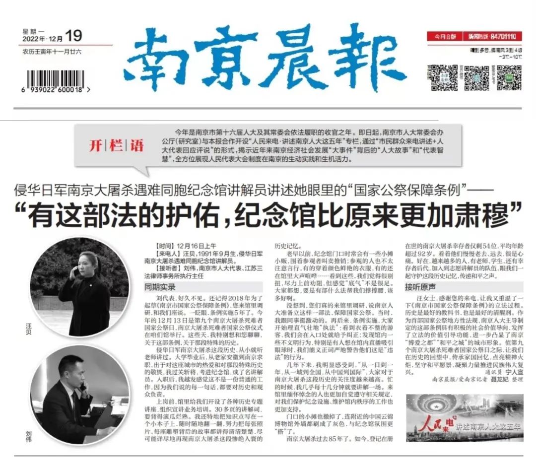 汪女士,感谢您的来电,让我又重温了一下《南京市国家公祭保障条例》的立法过程。历史是最好的教科书,也是最好的清醒剂。作为首部国家公祭地方性法规,南京人大主导制定的这部条例具有积极的社会价值导向,发挥了立法的价值引导功能,进一步凸显了南京“博爱之都”“和平之城”的城市形象。值第九个南京大屠杀死难者国家公祭日之际,让我们在历史的回望中,传承家国回忆,点亮精神火炬,坚守和平愿景,凝聚力量推进民族伟大复兴。