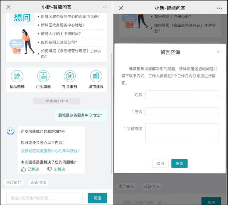 推进“网办”,畅通咨询是关键。新城区行政审批服务局依托“新城政务服务”微信公众号,上线了“智能客服”服务,运用大数据方式集成推送全区所有政务服务事项办事指南及业务办件中的常见问题。办事企业和群众可通过微信智能客服,7x24小时获取办件业务信息。对智能客服“未解决”的问题,由专人登记问题并电话回访,确保办事企业和群众问得清,办得明。