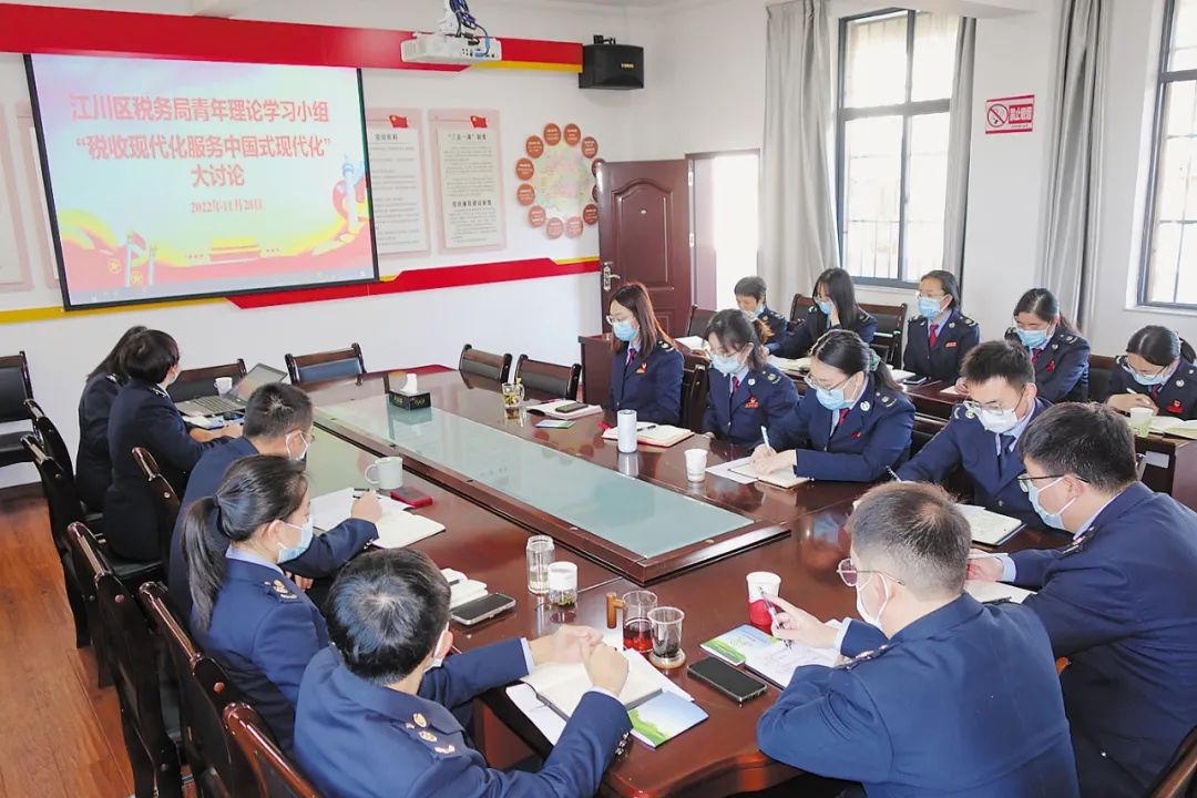 图为国家税务总局玉溪市江川区税务局青年理论学习小组开展“税收现代化服务中国式现代化”大讨论学习活动。