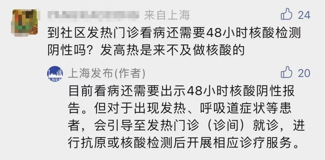 上海发布回复:目前看病还需要出示48小时核酸阴性报告。但对于出现发热、呼吸道症状等患者,会引导至发热门诊(诊间)就诊,进行抗原或核酸检测后开展相应诊疗服务。