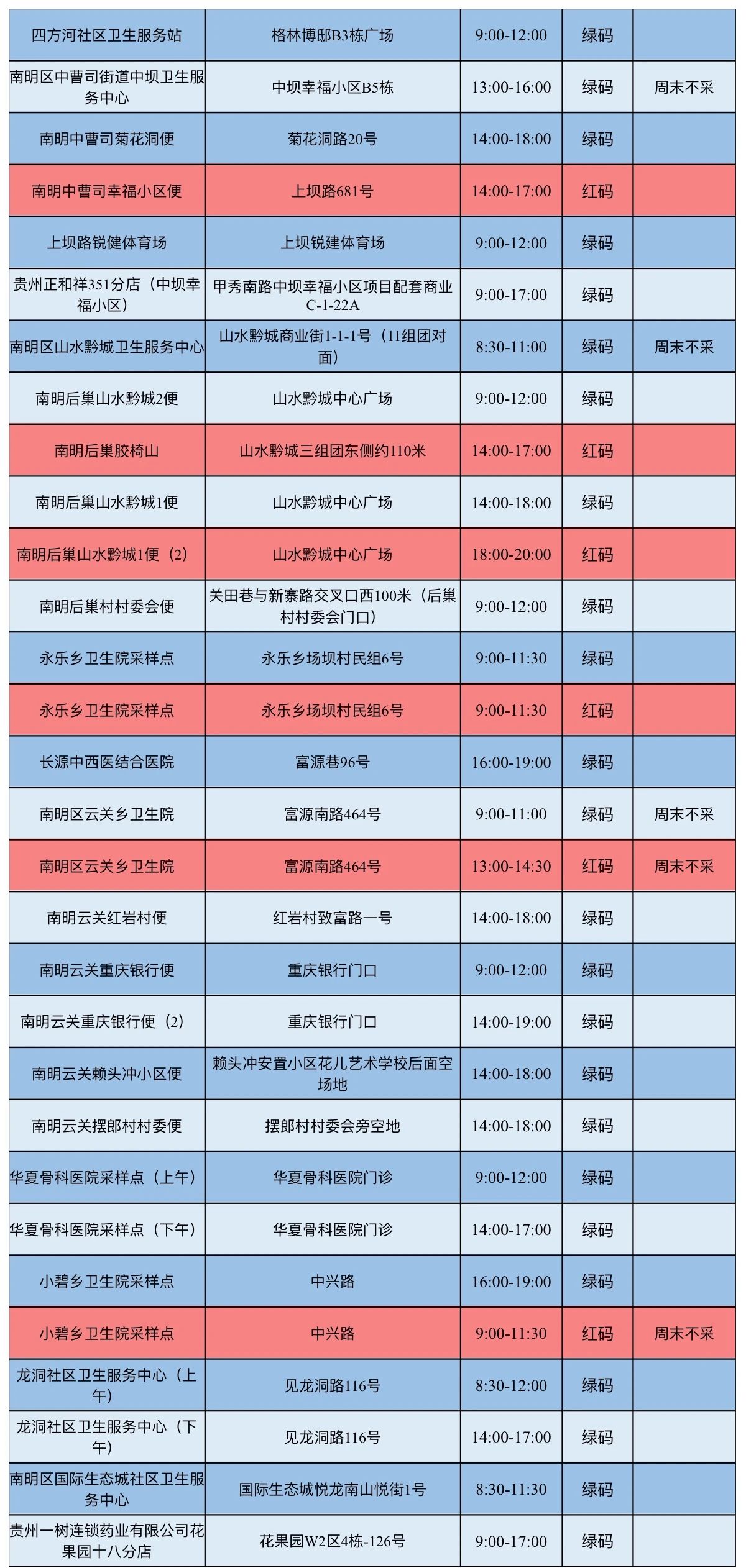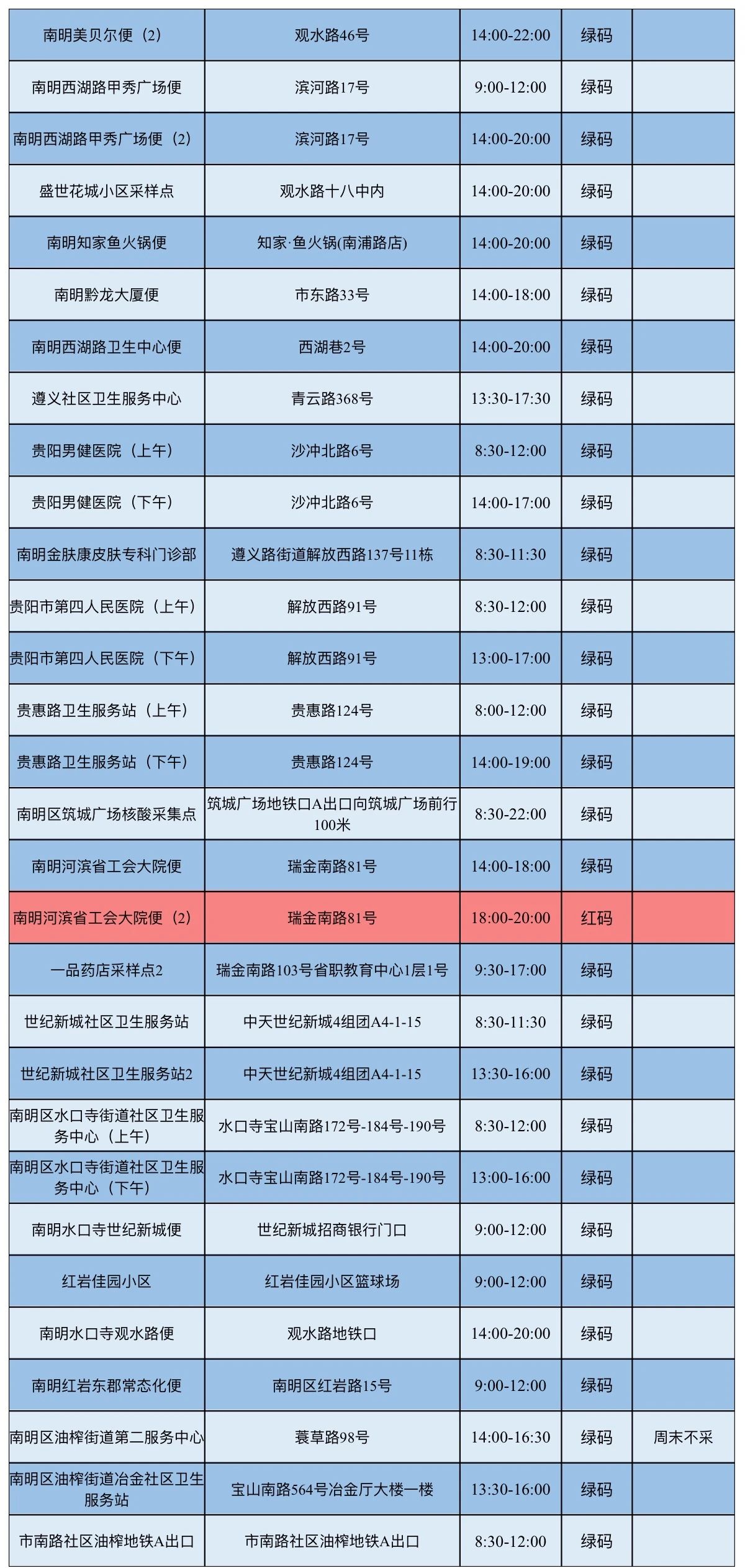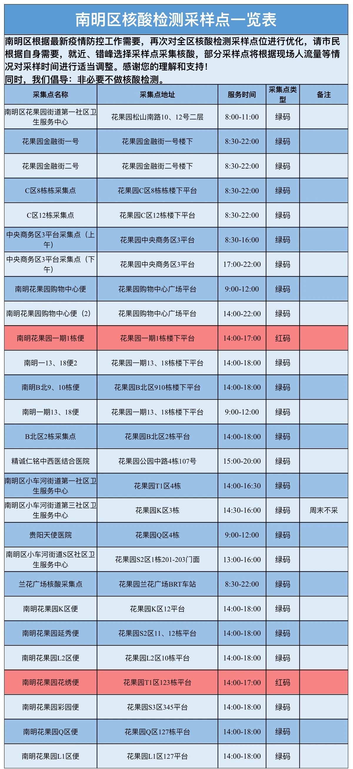 南明区根据最新疫情防控工作需要,再次对全区核酸检测采样点位进行优化,请市民根据自身需要,就近、错峰选择采样点采集核酸,部分采样点将根据现场人流量等情况对采样时间进行适当调整。同时,我们也倡导:非必要不做核酸检测!感谢您的理解和支持↓↓↓