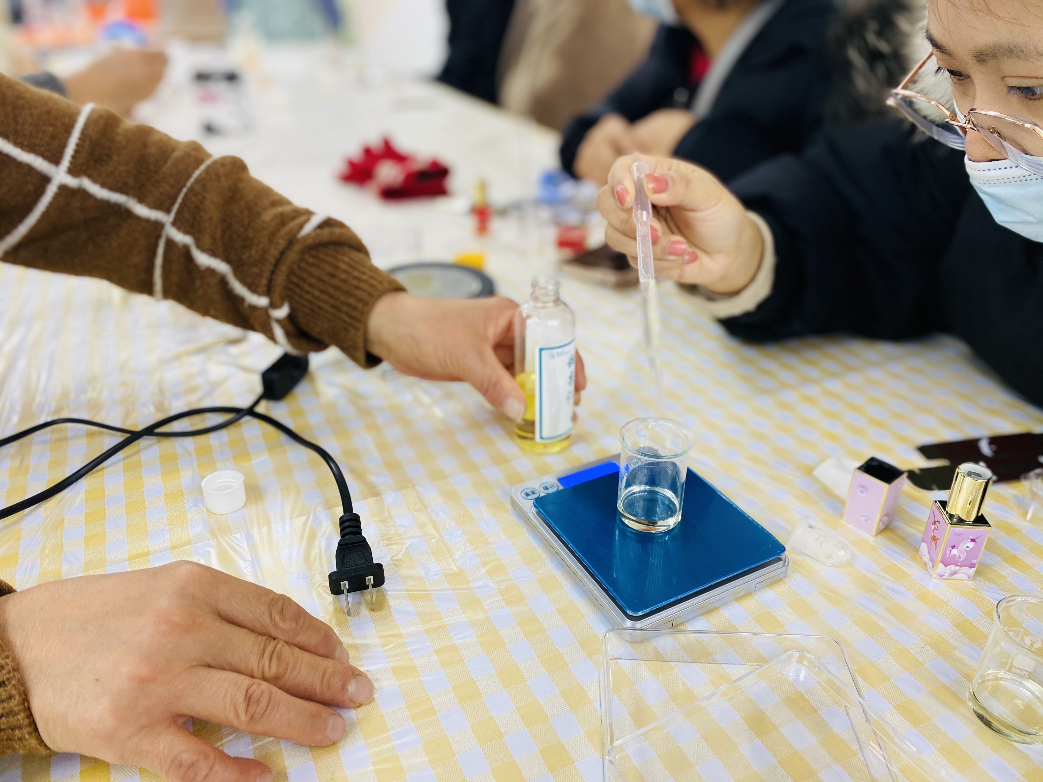 活动伊始,竹心老师向在场的居民们认真地讲解了制作唇膏的相关知识,介绍所需的材料以及如何正确地调配比例。首先用酒精把玻璃杯还有唇膏管进行消毒,等待自然风干。然后将蜂蜡和适量的橄榄油加入玻璃杯中加热,等到蜂蜡完全融化之后加入精油和维生素E,就可以灌管塑性了。