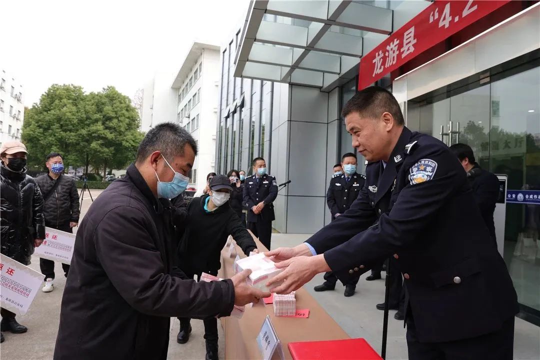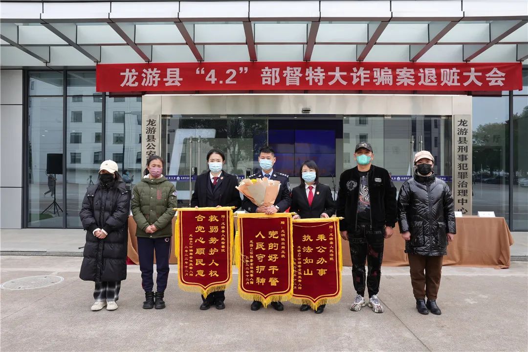 退赃大会上,十多位受害人代表,满怀激动,接过自己被追回的损失,并为公检法一线人员送上了锦旗和鲜花,以无声的语言表达自己的感谢。