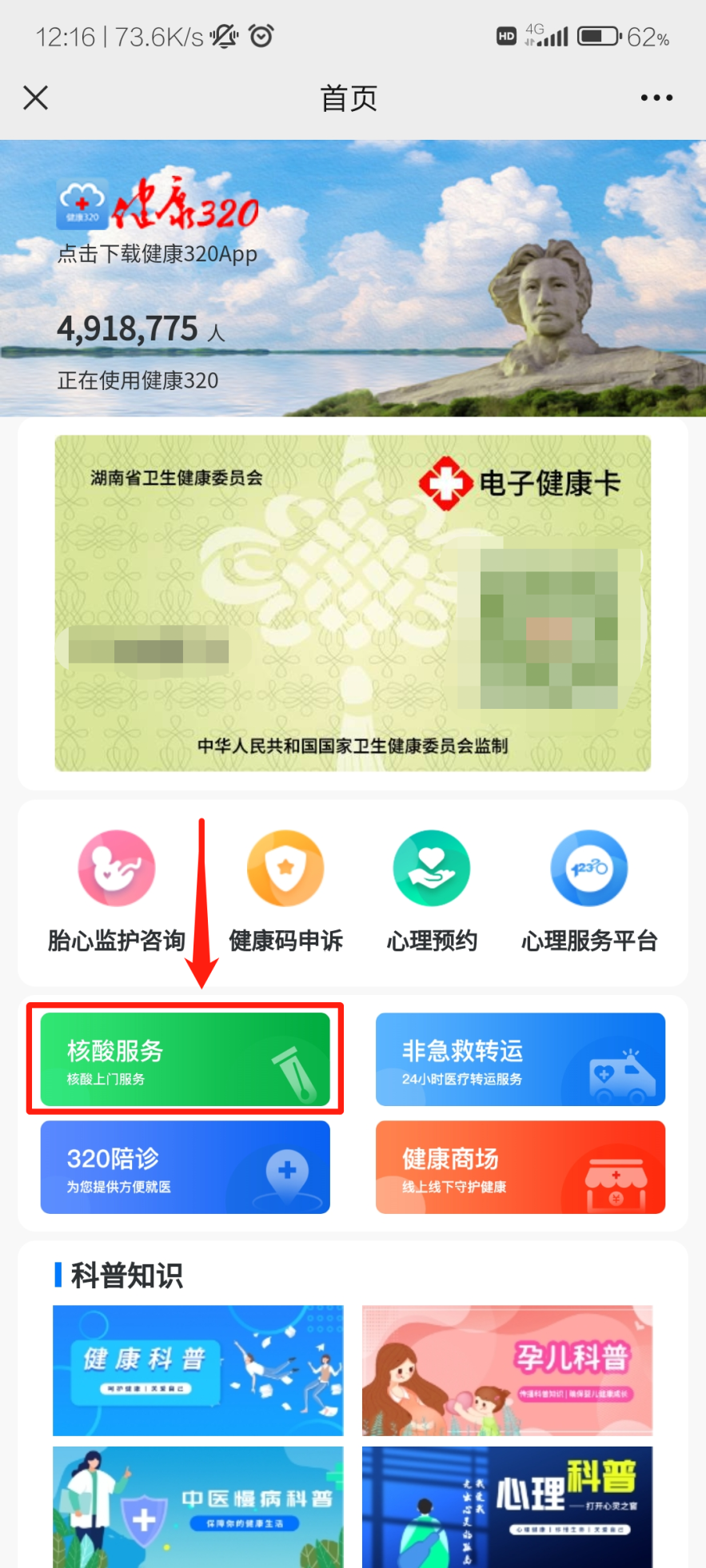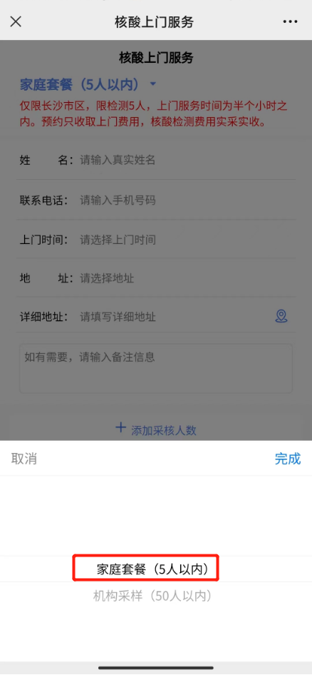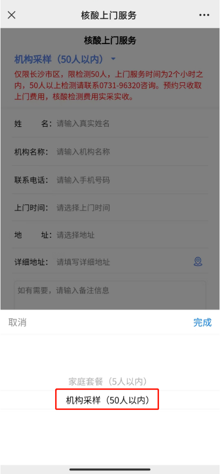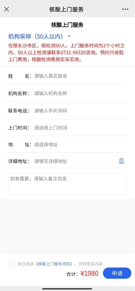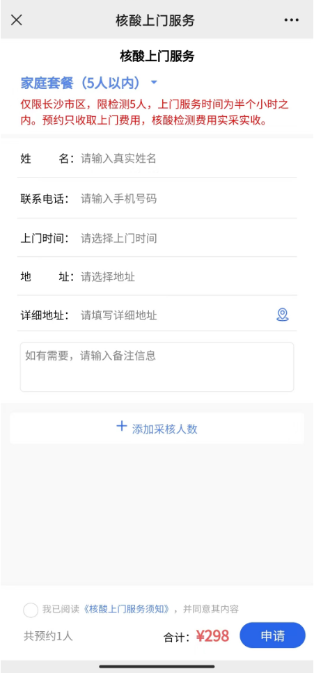 针对这一现象,健康320平台联合权威的核酸检测实验室推出了“上门采样”服务,结果可同步至湖南省居民健康卡。目前暂时只开通长沙市区范围。