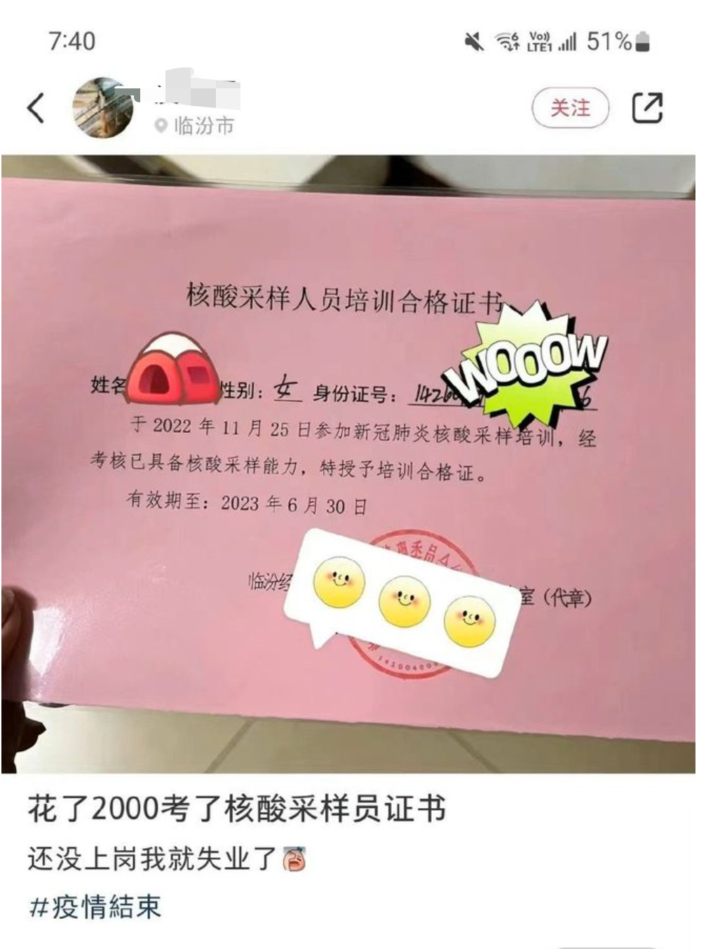 12月18日,临汾市公安局经济技术开发区分局通报称,经查,该女子未花费 2000元办理核酸检测证,其为蹭网络热度编造发表了内容与事实不符的帖子。目前,其因寻衅滋事,已被公安机关依法处以行政拘留五日的处罚。