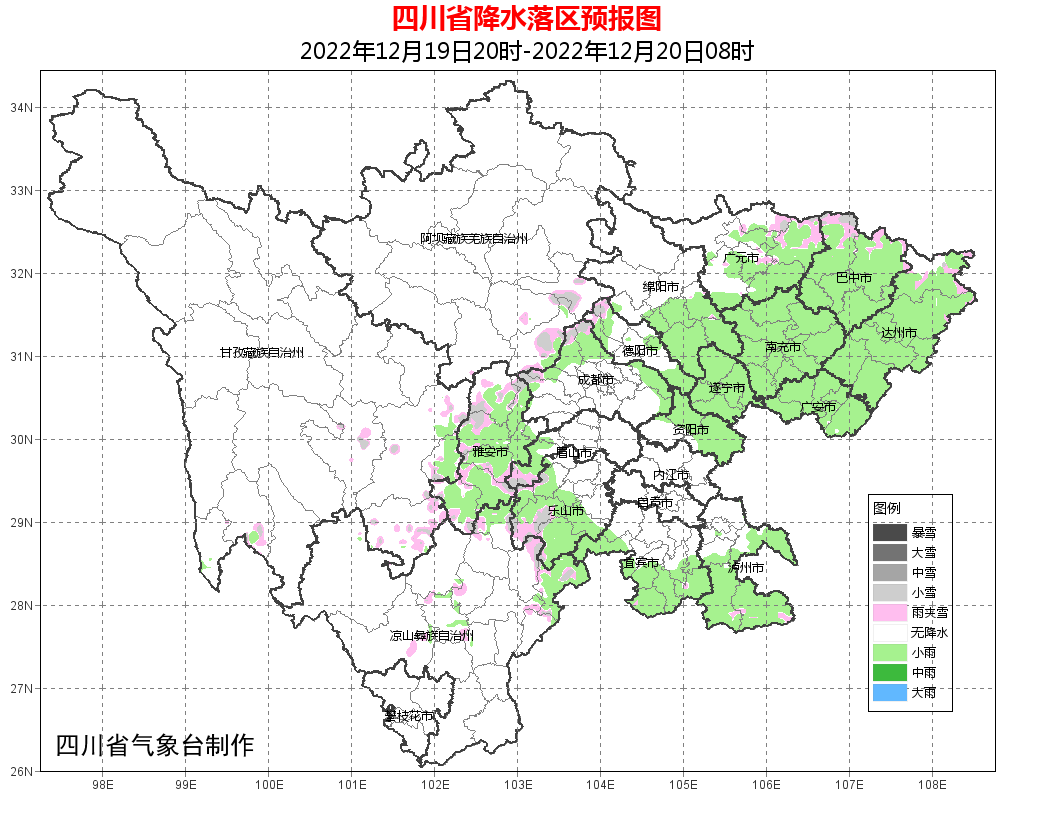 今天晚上:盆地各市阴天,部分地方有小雨或零星小雨,盆周山区有雨夹雪或小雪;川西高原大部多云间晴;攀西地区大部多云。