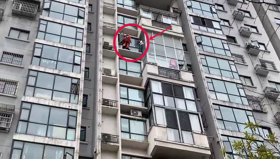 消防救援人员到达现场后,看见居民楼9楼窗台外正站着一名女子,其肢体晃动摇摆、情绪激动暴躁,随时可能跳楼,现场情况十分危急。