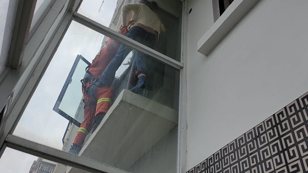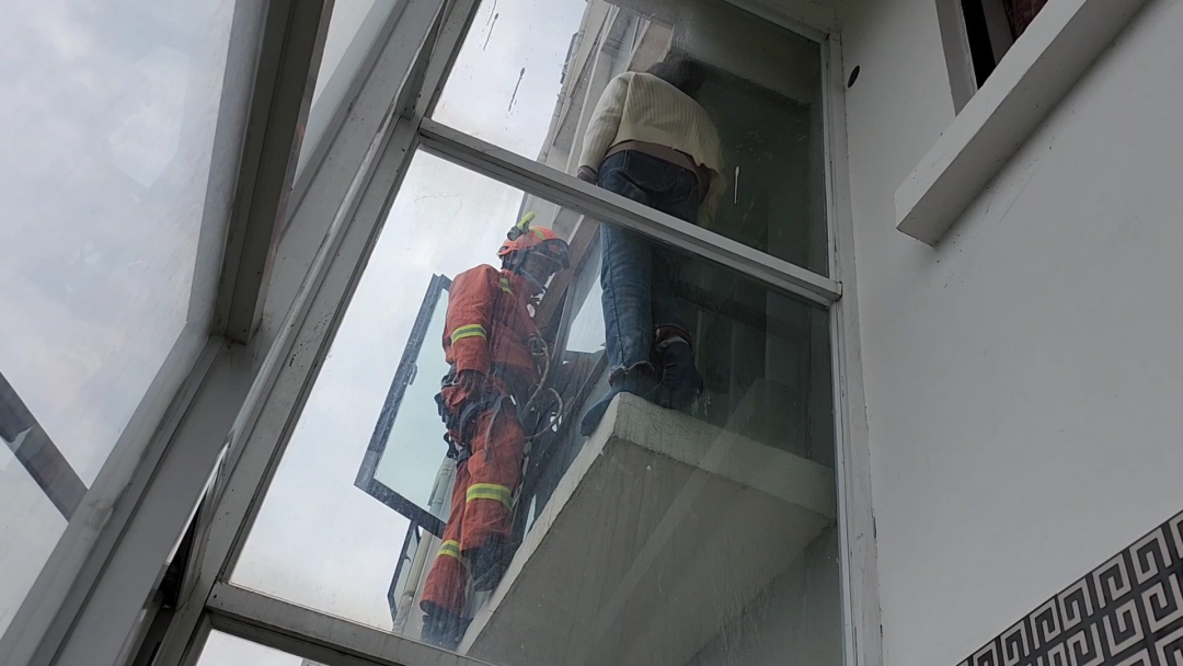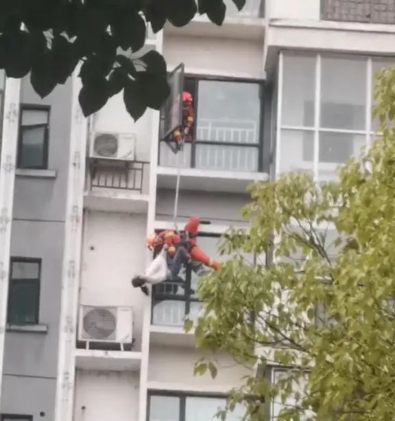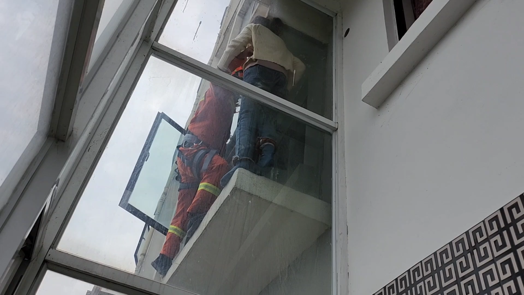 12时01分,救援人员趁轻生女子恍惚之际,箭步飞扑出窗外将其紧紧抱住,而该女子却因精神状态不佳胡乱挣扎,对救援抵触并不断尖叫,给救援带来了难以预料的困难和意外因素。