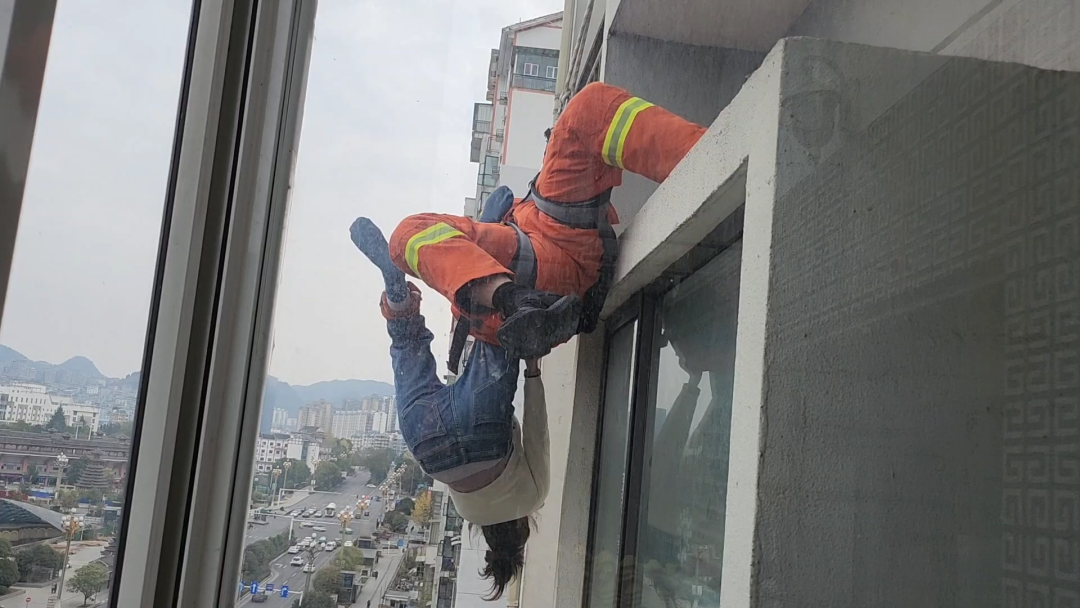 就在救援人员即将把女子救入室内的瞬间,女子不配合并不断肆意挣扎,施救消防员失去重心,二人迅速向后倒去并下坠,身体一时悬在半空中。