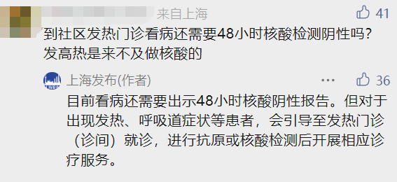 上海发布回应:目前看病还需要出示48小时核酸阴性报告。但对于出现发热、呼吸道症状等患者,会引导至发热门诊(诊间)就诊,进行抗原或核酸检测后开展相应诊疗服务。